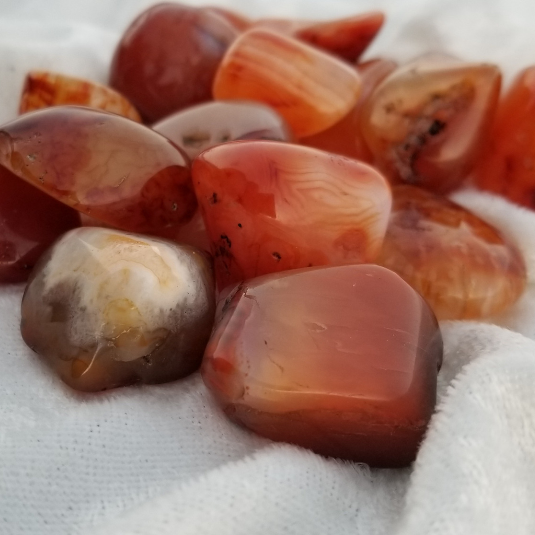 Carnelian keeps you focused on the here and now. This grounding energy keeps unnecessary negative thoughts at bay creating a space for you to stand in your own power and authenticity. If you are looking to cultivate strength and want help finding your voice these beautiful tumbled carnelian will aid you in this endeavor.